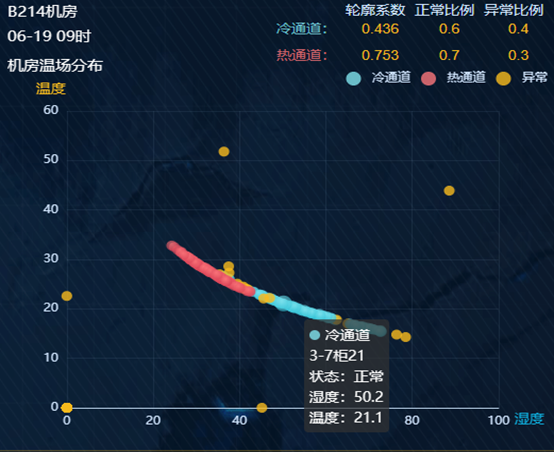 瀛海数据中心的两间云机房实现了机柜级温湿度监测。原有监控系统列表化的温湿度数据通过孪生建模,转换成以颜色区分,可以定性呈现分析的机房温场。并在后期采用聚类算法对机房冷热通道温湿度数据进行聚类建模,通过点位密度、异常点分析、轮廓系数等指标对机房环境整体情况进行宏观定量分析,以实现对机房异常温湿度点位的精准分析和预警。以往的监控手段都是事后告警,而利用了AI算法之后就可以实现实时高效地检测异常数据,并提供预警措施等,极大的增强了机房运行的安全性。